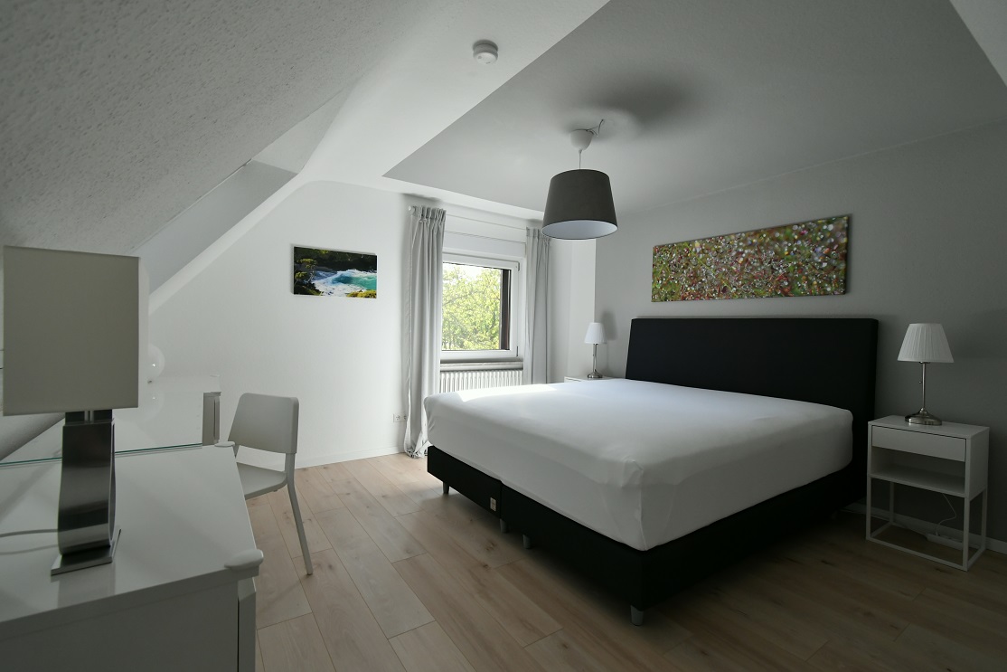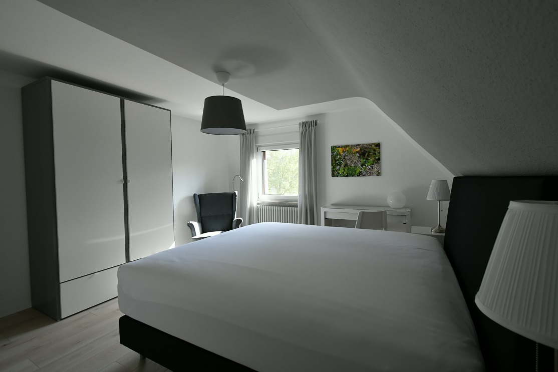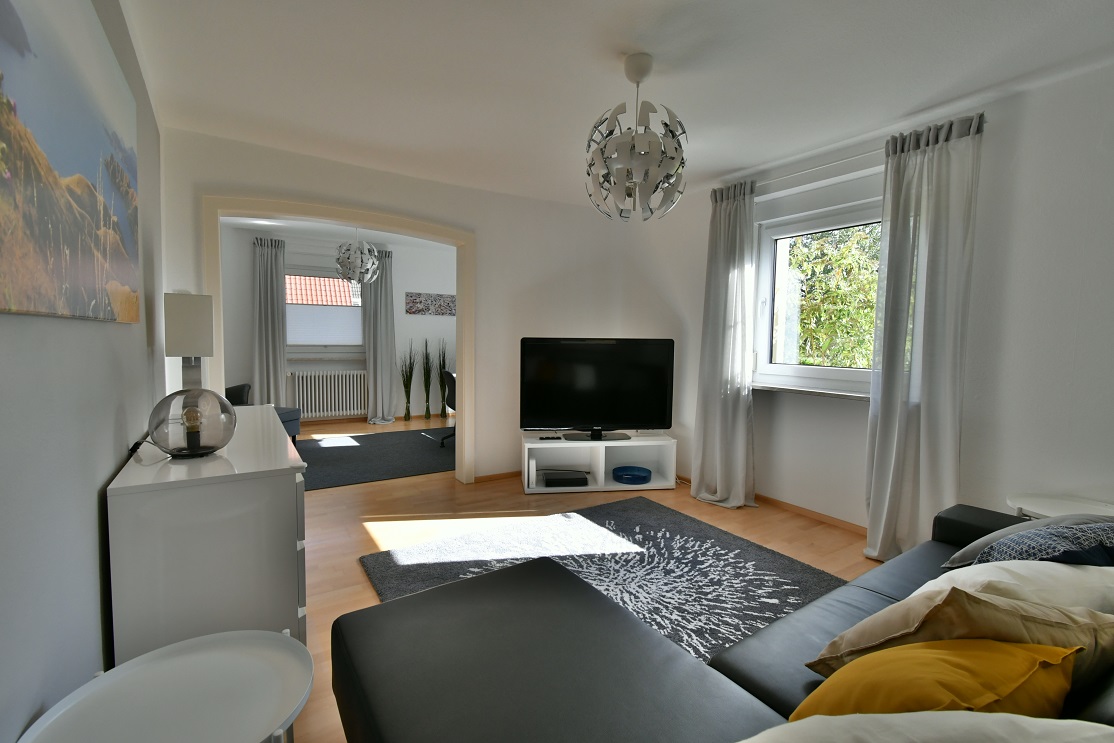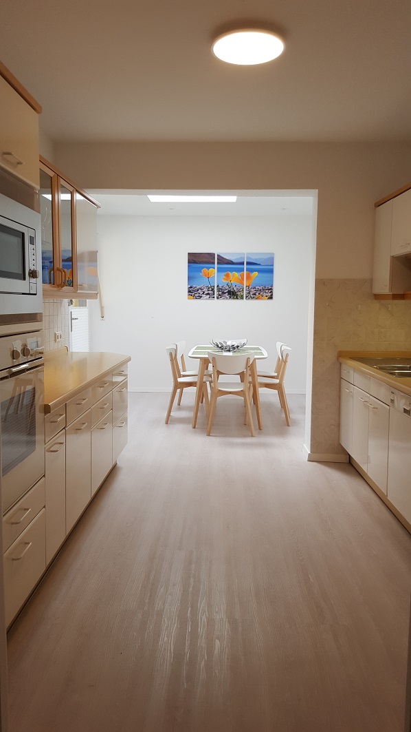 Die voll möblierte Doppelhaushälfte drei Etagen, zwei Schlafzimmer mit komfortablen Boxspringbetten (King-size), komplett ausgestattete Einbauküche offen übergehend in grosszügigen Essbereich mit Oberlicht und Hofeingang, Arbeitszimmer mit 150Mbit Internet, übergehend in Wohnzimmer mit 100cm Kabel-TV, Tageslichtbad und zwei Toiletten, freies Studio, Garderobe, separate Waschküche (moderne Waschmaschine und Wäschetrockner, Bügelbrett und -Eisen), weiterer Kellerraum nach Vereinbarung, gepflegt, nicht barrierefrei bei ein paar Stufen ins EG und Treppe in OG
