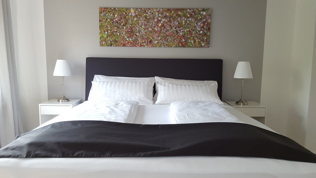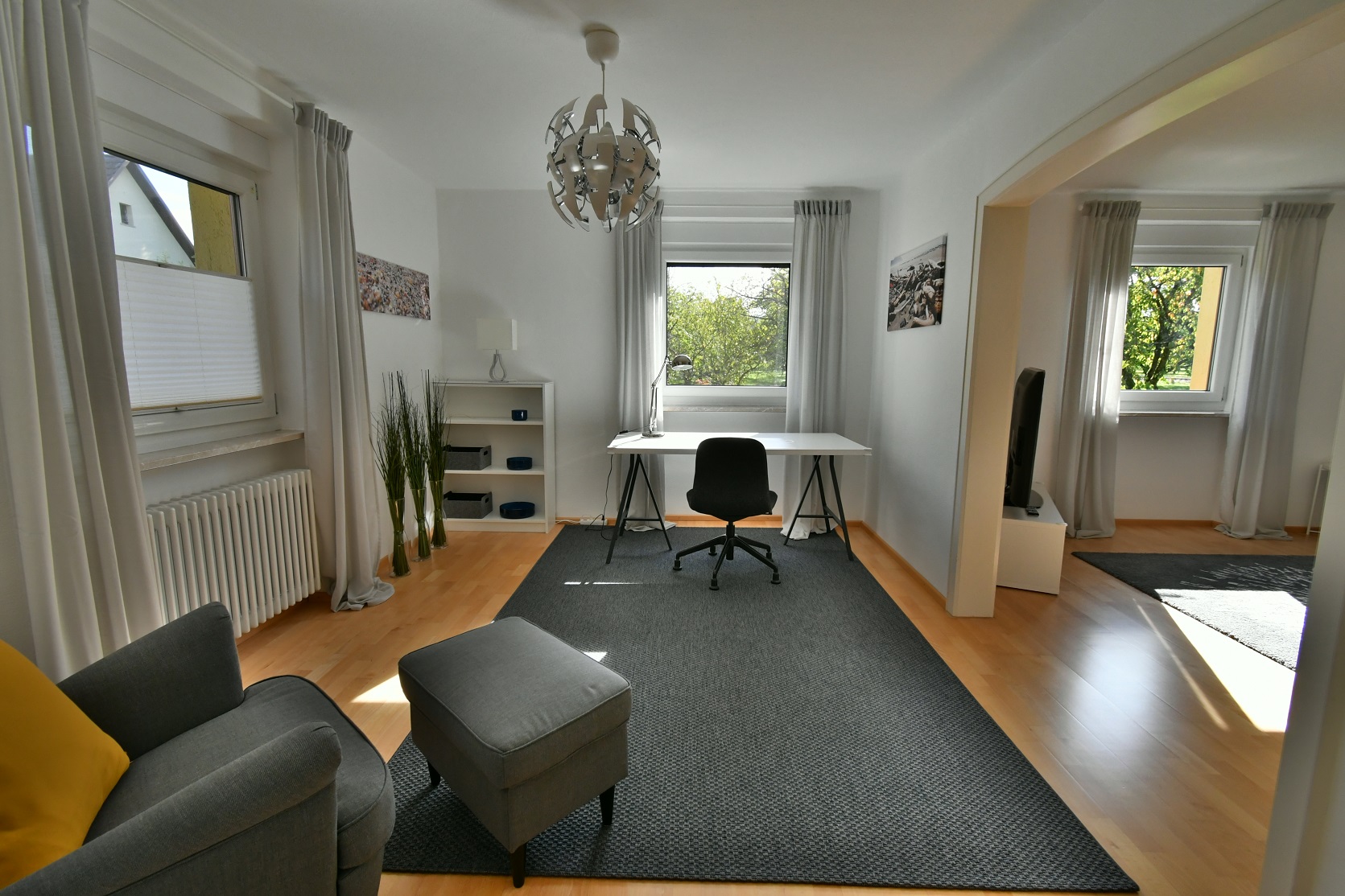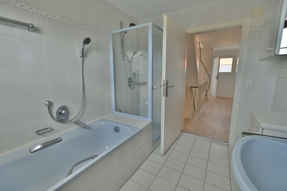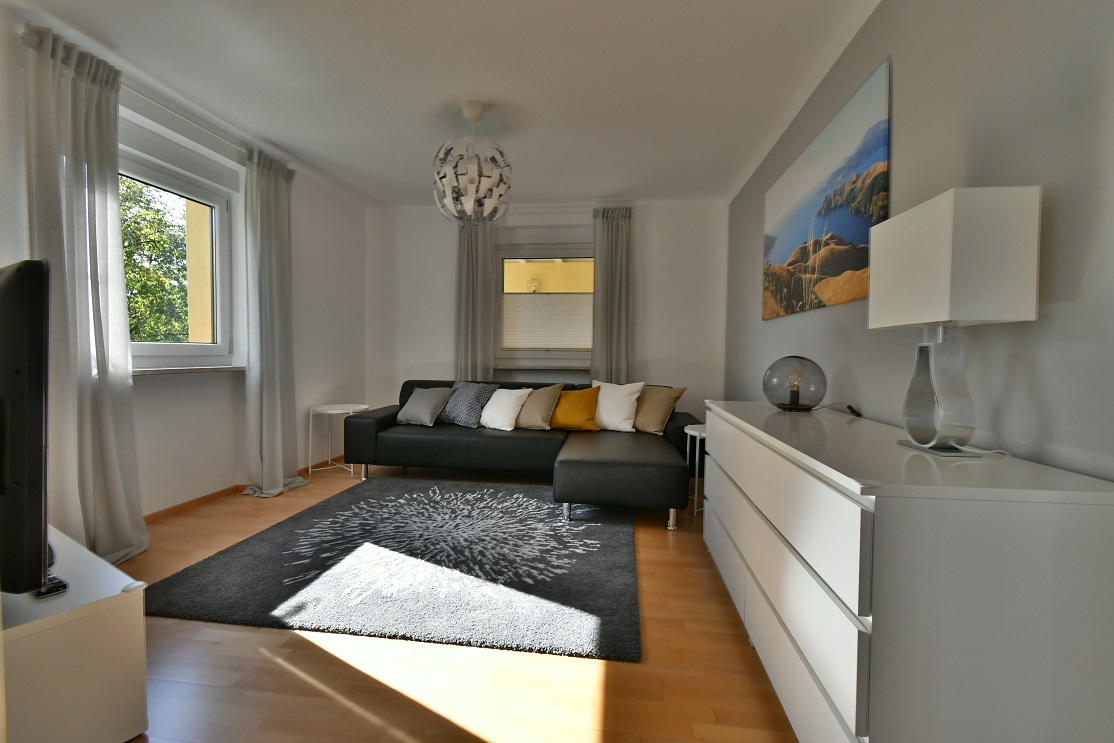 Die voll möblierte Doppelhaushälfte drei Etagen, zwei Schlafzimmer mit komfortablen Boxspringbetten (King-size), komplett ausgestattete Einbauküche offen übergehend in grosszügigen Essbereich mit Oberlicht und Hofeingang, Arbeitszimmer mit 150Mbit Internet, übergehend in Wohnzimmer mit 100cm Kabel-TV, Tageslichtbad und zwei Toiletten, freies Studio, Garderobe, separate Waschküche (moderne Waschmaschine und Wäschetrockner, Bügelbrett und -Eisen), weiterer Kellerraum nach Vereinbarung, gepflegt, nicht barrierefrei bei ein paar Stufen ins EG und Treppe in OG